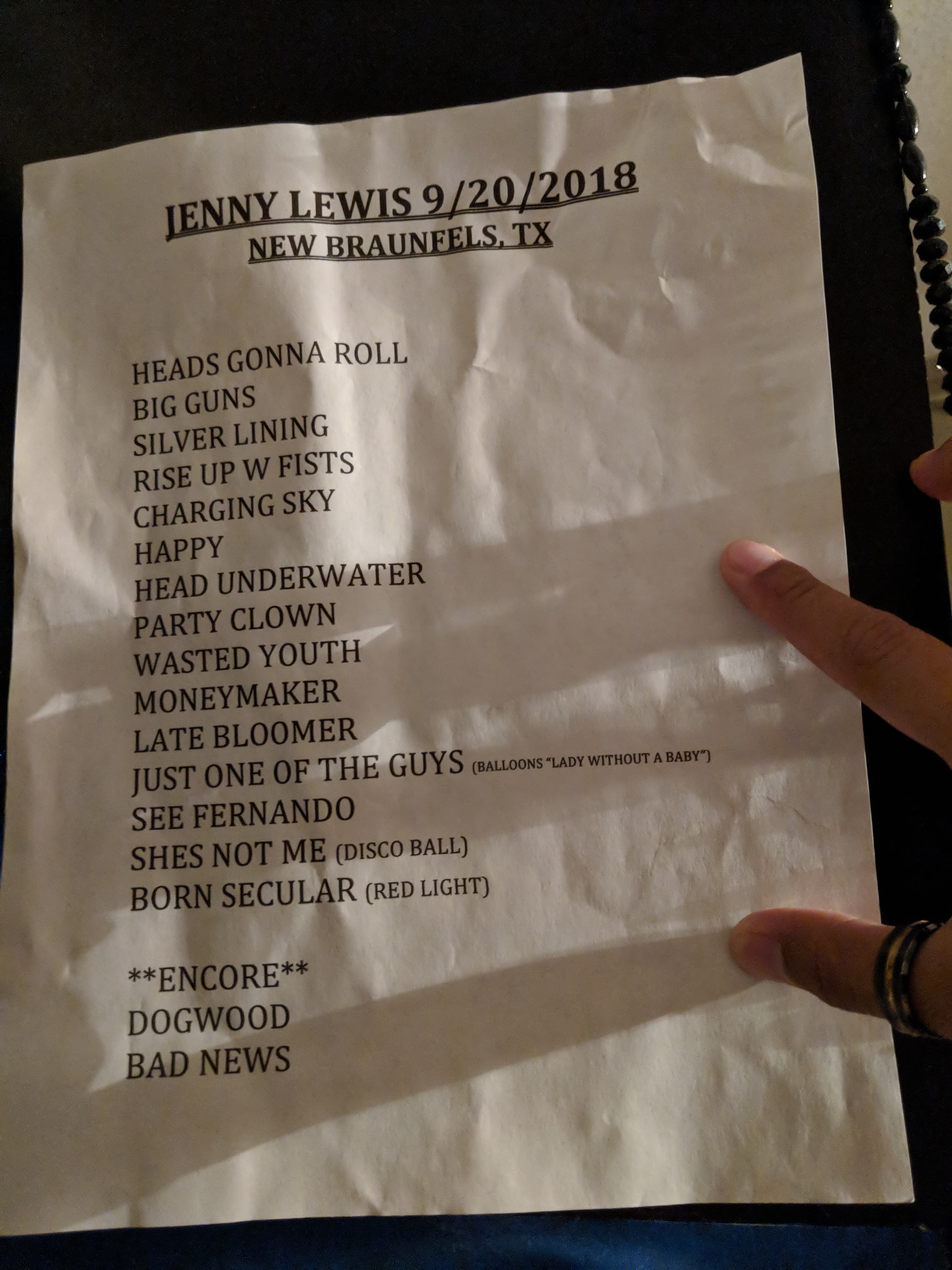 set list Full size 3024 × 4032 pixels Jenny Lewis, 9/20/2018, Gruene Hall, New Braunfels, Photos – Write-up Like this:Like Loading... Share this: Share on Facebook (Opens in new window) Facebook Share on X (Opens in new window) X More Share on Reddit (Opens in new window) Reddit Share on Tumblr (Opens in new window) Tumblr Share on Pinterest (Opens in new window) Pinterest Email a link to a friend (Opens in new window) Email Like this:Like Loading... Previous image Next image Leave a ReplyCancel reply This site uses Akismet to reduce spam. Learn how your comment data is processed.
